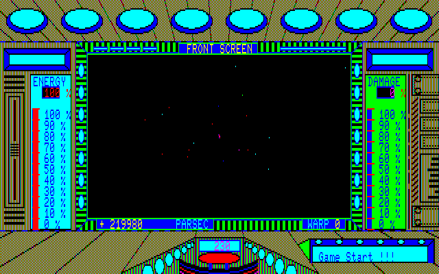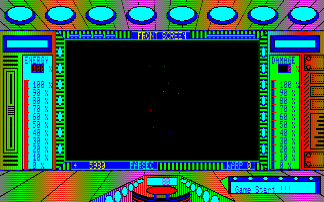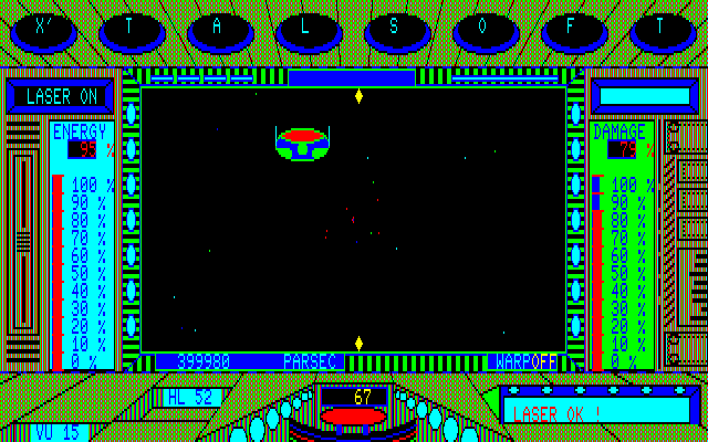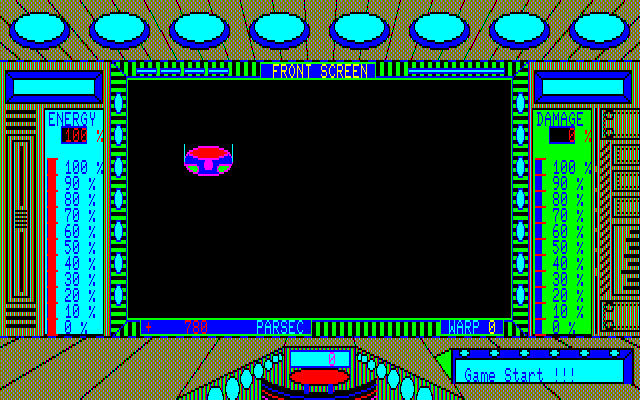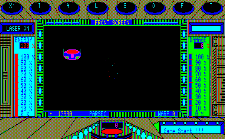 I finally threw in the towel, as this is All the Adventures, not All the Space Simulators. I have here a video of the game played on Sharp X1 cued to start right at “0 PARSECS” with the planet in view. Once pointed the right direction, your ship will enter orbit and you press F5 to activate the next section of the game.