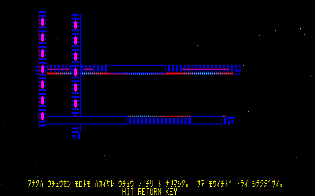Cosmo Cross is part space shooter, part adventure game. It was originally for PC-88 (the version I’m playing) and later got a Sharp X1 port. It isn’t quite like Probe One: The Transmitter with both running simultaneously forcing the player to leap between joystick and keyboard rapidly; a better comparison is The Desecration, which switches between “arcade segment” and “adventure segment”. The Desecration’s arrangement is: