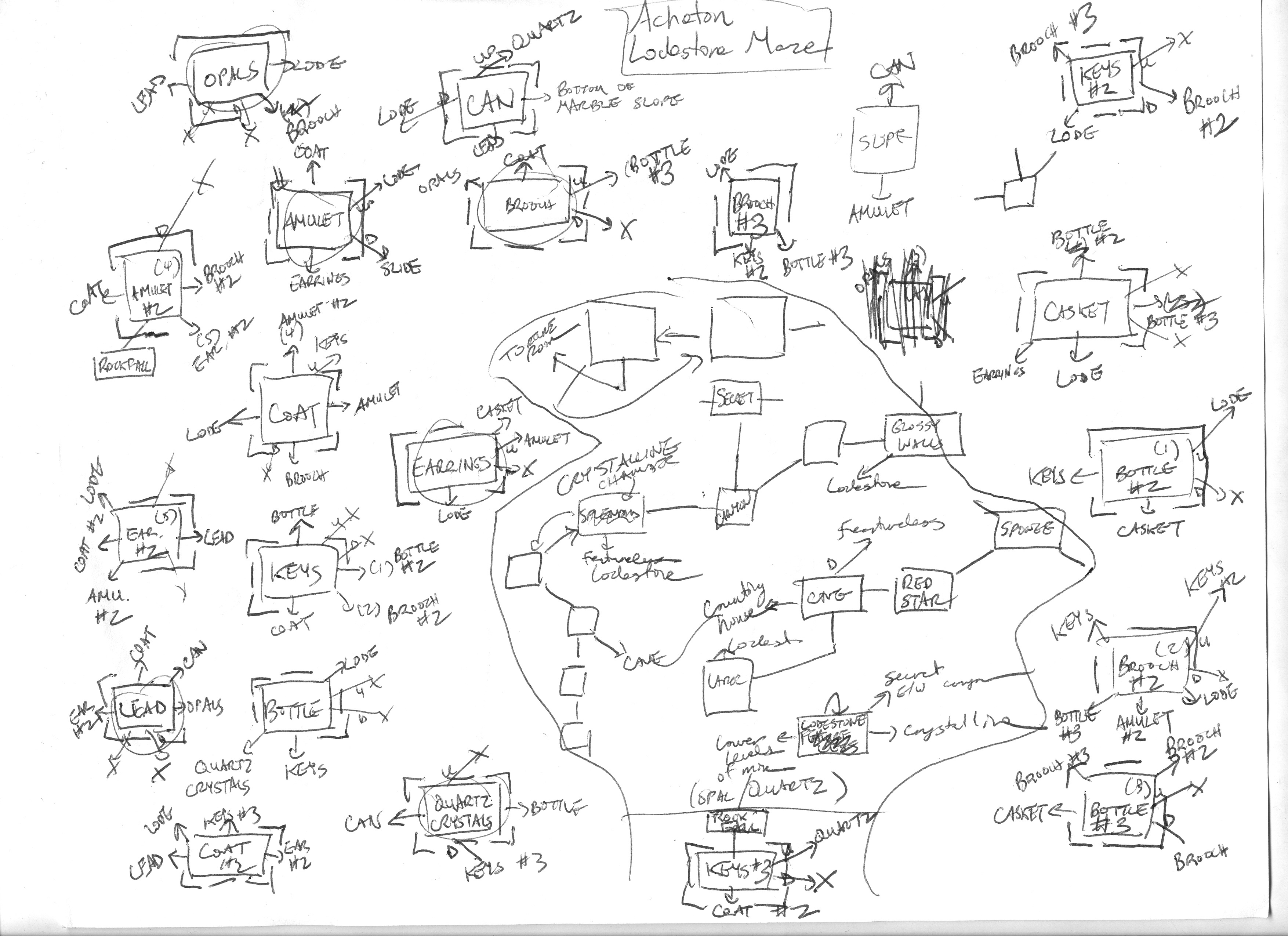 a.) The lodestone maze depicted in the map above. The “unique” trick here is the treasures are randomly arranged at the start of a game so a walkthrough needs to give a route that passes through every room (hence Matthew’s desire for a Hamiltonian path).