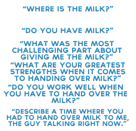 The humor is of the “let’s put the PC in uncomfortable situations” type. Unfortunately, getting milk off someone drinking glue or potentially stealing milk from a baby just didn’t work as humor. This is possibly because the ideas didn’t work to begin with, but I theorize it may be that the humor in those sections was more railroaded than participatory. Let’s take a bit I did like, from someone who thinks you’re giving a job interview: