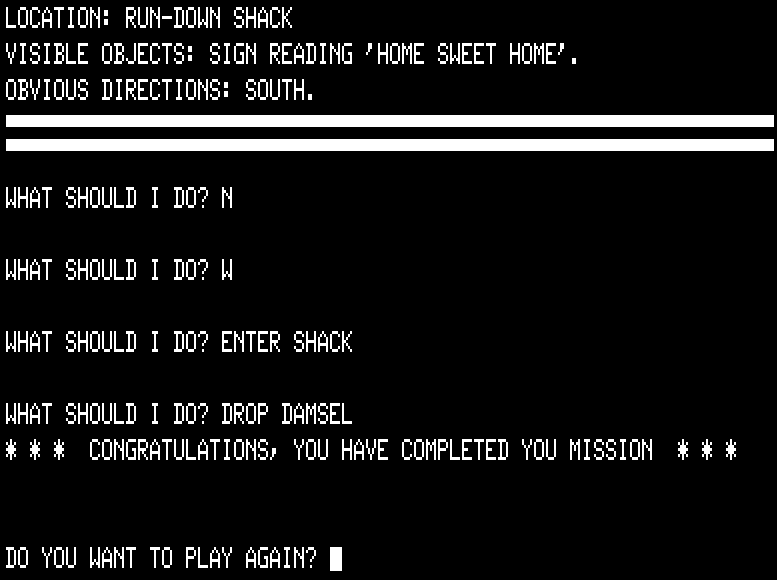 It’s been a while since I’ve done a solve off the computer. It’s one of the things I enjoy most about adventure games, but the early-era ones often rely on in-game experimentation in a way that just stopping and thinking isn’t quite enough to solve a tricky puzzle.
