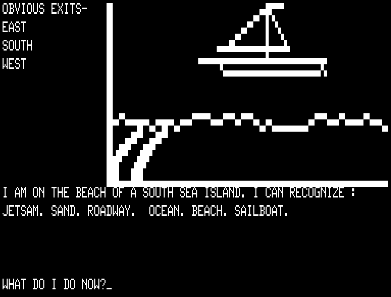 My usual online-Javascript site doesn’t do well with this game, so if you’d like to try it out, you’ll need an emulator and a download. It’s a little less ambitious / revolutionary than Mystery House and consequently a little more playable.
