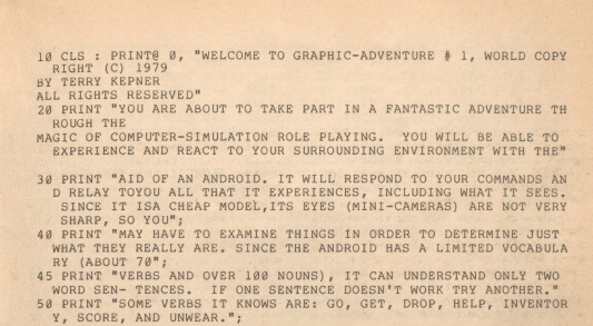 “Likely the first”: We have the source code above, solely credited to Teri Li (which includes lots of POKE statements to make the graphics, basically making assembly language in BASIC source) although I haven’t been able to find it published anywhere except The Captain 80 Book of Basic Adventures which came two years later. Based on the history of how Spider Mountain was written, there is strong reason to suspect this version had a 1979 release in stores. However, the only extent tape copy I have been able to find (see eBay picture above) is a machine language version released a year later which adds Mark Robinson to the credits. It’s still possible with a 1980 release it came first, but I haven’t been able to dig up any records.