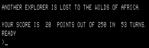 This marks the fourth adventure game we’ve seen where a weapon is mostly useless and can get you into trouble. (Other instances: Burial Ground Adventure, Pyramid of Doom, Lost Dutchman’s Gold.) I think this is enough to say we have a genuine pattern here; the idea of using your brains, wits, and navigation skills as opposed to just applying force perhaps was an intentional attempt to distance the genre from CRPGs and other games of a more violent nature. (In this specific case, perhaps the authors were trying to say something about colonialism.)