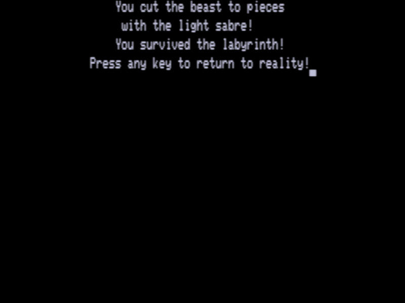 To loop back to my comparison of this game with Deathmaze: I still hold that Deathmaze had a stronger plot. This is despite the razor-thin “your only job is to escape” opening. There was a genuine arc: opening bottleneck -> progress to level 4 -> defeat of the monster on level 4 -> teleport to level 5 -> fight with the monster’s mother -> grand finale with the exploding maze. Labyrinth, while much tighter on puzzles (despite a few teeth-gritting moments like the cave gnome) didn’t have that kind of dramatic tension, and while the sense of humor was roughly the same, the atmosphere of Labyrinth was generally sillier.