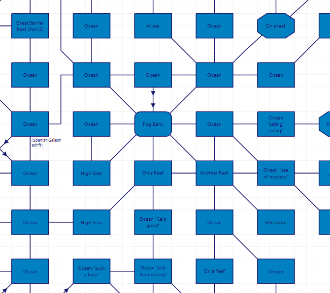 You may notice a thread of not-terribly-satisfying solutions, and that unfortunately held for most every problem that remained. All this time in the ocean there’s been a Spanish Galleon moving about, and I finally found (via a hint of Russell Karlberg’s) that standing on the deck of the ship and typing