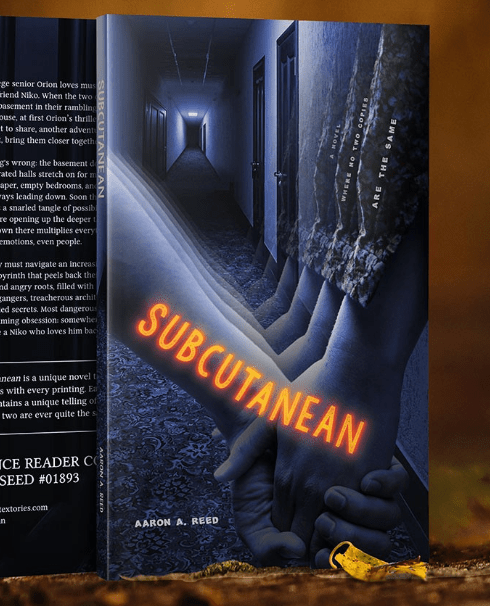 Subcutanean is a novel where each copy is custom-printed to be unique; where the author, Aaron Reed, wrote prose designed to spawn a multitude of variants in what he calls “quantum possibilities”.