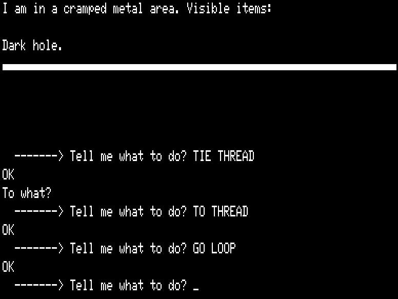 You already figured out PULL THREAD and TIE THREAD (to what?). Then you get stuck. It seems like when you’re stuck on something, especially in one of these games, the thing to do is try absolutely everything on absolutely everything. And then the insight is… one of the things you can try TIE THREAD to is the thread itself.