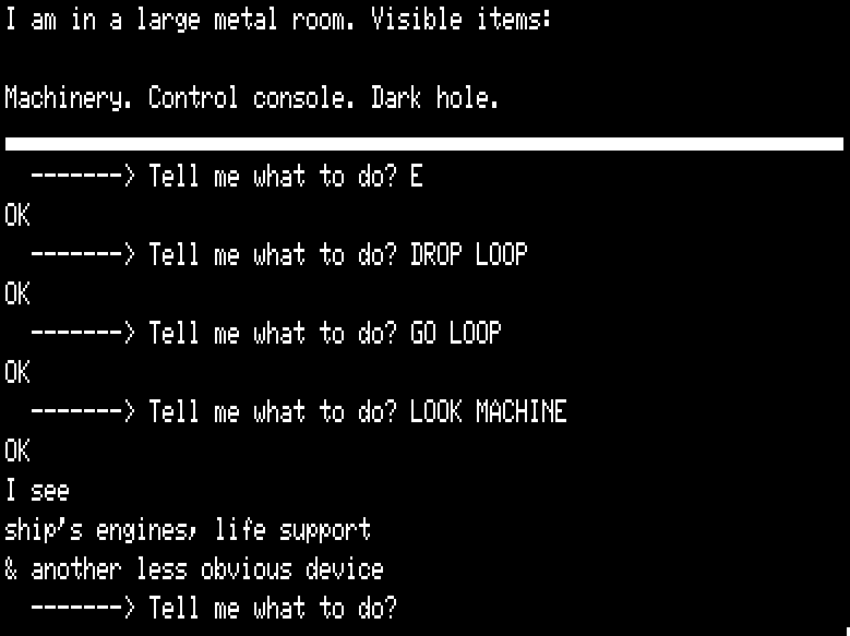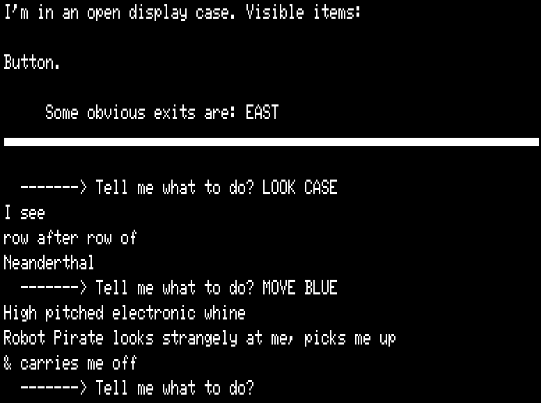 Even when tools are capable of supporting a piece of complex world modeling, that’s not the same as making it easy and natural to do. It’s quite plausible to say Scott Adams was scratching at the very limits of his system here. And certainly, the forced tightness of the text itself cannot be forgotten; for 1981 home computers the very words themselves were at a premium.