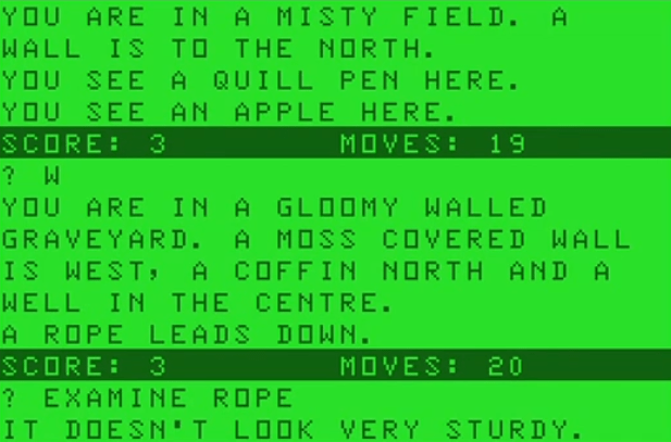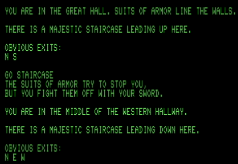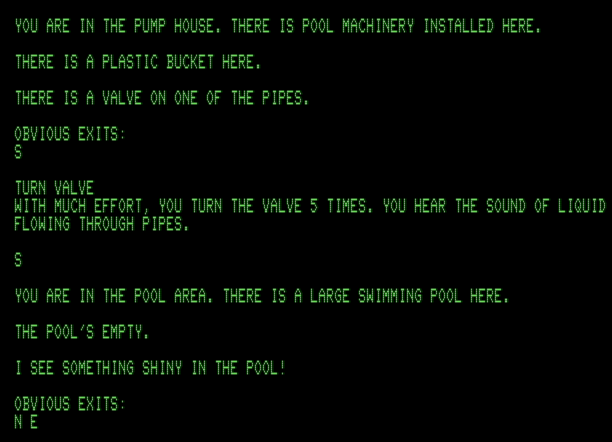 Even when tools are capable of supporting a piece of complex world modeling, that’s not the same as making it easy and natural to do. It’s quite plausible to say Scott Adams was scratching at the very limits of his system here. And certainly, the forced tightness of the text itself cannot be forgotten; for 1981 home computers the very words themselves were at a premium.
