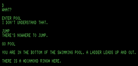 (The game clearly understood what I meant: why not just parse it? The same issue came up with Cavern of Riches. I can understand trying to train the player in a system to make things easier, like Adventure letting the player know they can just type W rather than GO WEST after they’ve done it enough times, but this case was just an alternate phrasing.)