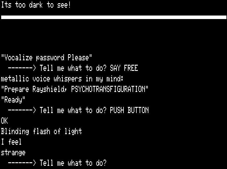 A question Mike Taylor raises is: just how much was he stymied by technical issues and the capabilities of the system? Nearly every puzzle is at least moderately difficult; for 1981 the conceptual idea of hopping between bodies and having one’s abilities change in the process was enough as is, and I think the only reason I had a smooth time over it was the benefit of years of videogame history where this sort of shtick recurs in many ways.