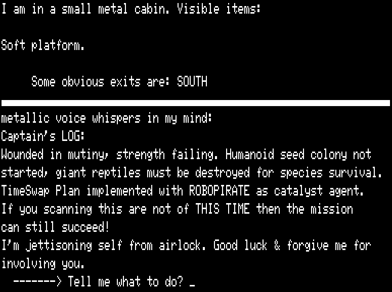 OK, let’s backtrack and go over the plot. You start off in the Astro-Navigation Room with a mysterious HATCH that won’t open but access to most of a ship, and find a TRIBBLE, CAP, SPACESUIT, and LAMP.