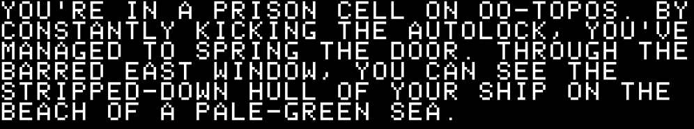 Just to give a quick idea of the version differences: while this game has the lock already broken by the main character, the 1986 edition requires you to BREAK LOCK yourself. The 1986 opening room also contains a bottle and some food, and you have to LOOK THROUGH WINDOW to see your ship.