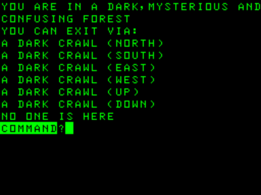 After a few rounds of SAY CROND (and variants) I assumed I needed an item or some such, but I discovered later the game wants you to type CROND just by itself; this teleports you over to another part of the map. This is akin to one of the magic words in Adventure that takes you to a “connected” area — you can just walk from one place to the other if you like — but it is meant to shorten travel time.