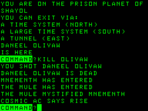 Clearly, just bringing someone in who has written some books to make a game does not automatically give said game the same qualities of character, writing, and plot that you might expect. To compare with a game from an experienced hand: Savage Island Part 2 has a part where you swap brains with a Neanderthal; judging from Crystal Phoenix and Berlyn’s later work, this type of idea would mesh with Berlyn’s interests, but I doubt the codebase for Oo-Topos was even capable of handling such a finesse. Berlyn’s follow-up of Cyborg is when he opens up a little more to book-writer tendencies (it’s written in first-person plural, for one thing); he likely needed to first get comfortable with game design and coding in general.