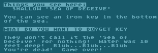 I’m guessing (adding in the TWINE I already mentioned) you know how to get the key, but the actual command took me a while: you’re supposed to TIE MAGNET. TIE POLE or MAKE POLE or ATTACH MAGNET don’t work. After that, GET KEY now maps onto the command “GET KEY BY USING THE FISHING POLE” rather than “GET KEY BY DIVING IN AND DYING”, although I admit I was rather nervous at first because the change in command is non-obvious and I could see THROW POLE or some other oddity being the solution.