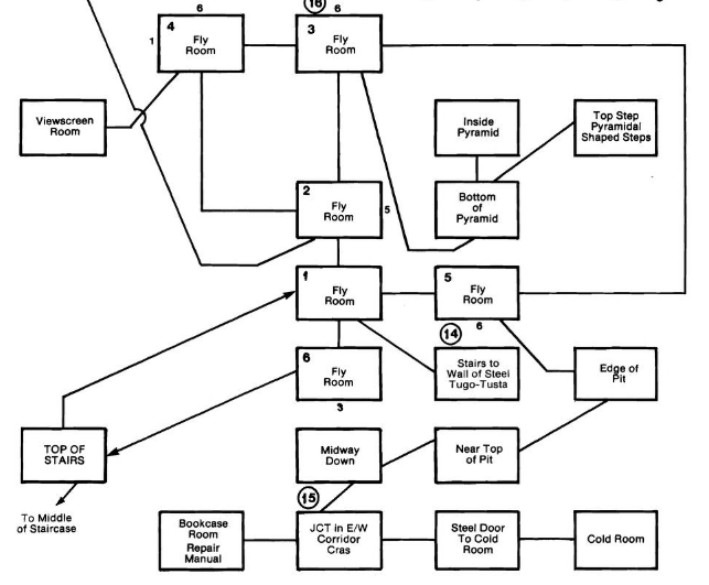The dotted lines indicate “magic word” connections. (The other two “words” are TUGO-TUSTA and TAKA<->LEVA. On the latter, I am unclear how you’re supposed to say an arrow symbol out loud, but that is exactly what you need to type for the teleport to work.) You’ll notice the magic words are essentially optional, except for that after taking the one-way trip from the Catwalks to the Fly Room area you’ll need a magic word to get back.