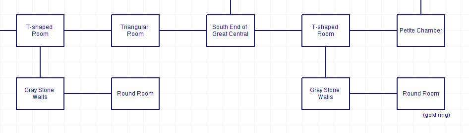 Here’s the clever part: notice the “T-Shaped Room” / “Grey Stone Walls” / “Round Room” that repeat shape on the map above. The second Round Room has a gold ring. If you pick up the ring, you get teleported to the first Round Room without any indication it happened. Then if you try to proceed as if nothing changed by going west, north, and east, you walk right into the Triangular Room, and get shot by the arrow that now points at the west door!