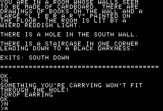 I got stymied by a guard who wants a gold coin, and found a very strange L I B R A R Y that didn’t let any of my objects in.