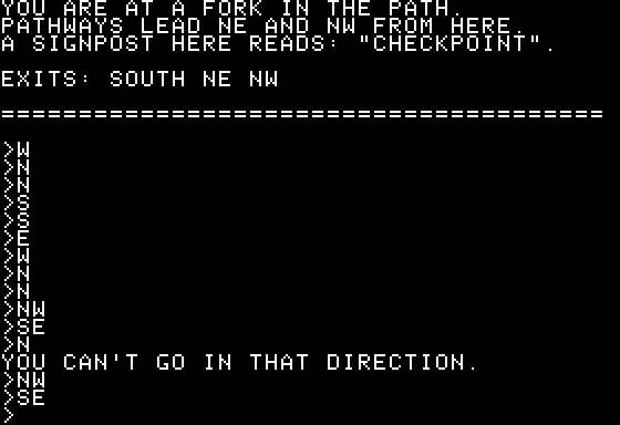 …it can also refer to a utensil, so GET FORK works, and removes the fork in the road! This changes the map so rather than there being a northwest and a northeast exit, there’s just north.