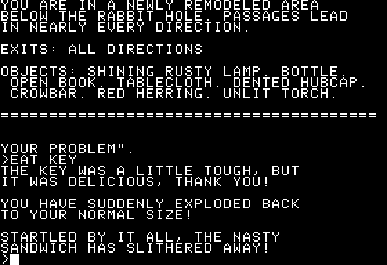 I had previously managed to get small by eating a sandwich, and pop in a rabbit until to an underground area. From there I was stuck; there was a nasty sandwich there, but if I tried to eat it, it ate me back. I was too small to pick up any of the items, including the lamp, so I wasn’t able to travel anywhere.