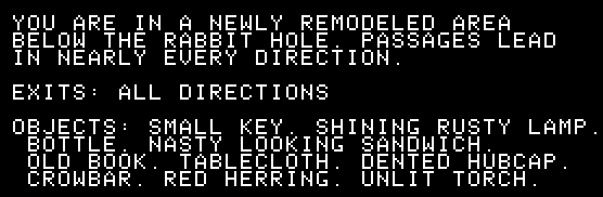 Mad Venture is one of those games in split-screen format where room descriptions, objects, and exits are consistently displayed on the screen, so the command LOOK by itself (which makes sense in single-window games to reproduce the room description) is a little redundant. In Mad Venture it gives the message