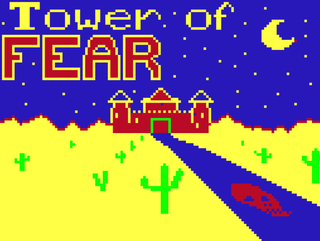 So according to the TRS-80 Color screen, it’s not a tower at all but a castle with some lowish turrets, in Arizona for some reason to judge by the saguaros, with a totally metal skull painted on the driveway?