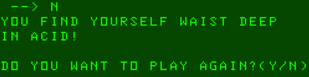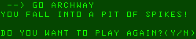 This game maybe didn’t sound impressive written out, but: while the traps would be considered tacky by modern game design standards, I felt enough on my toes that the atmosphere of the game held out; this was true even given the disappointing lack of a Wizard, who I assume fell into one of his own traps before I got there. Additionally: short and mostly solid coding where I didn’t have to fight with the parser. While clearly a light attempt, Tower of Fear was still a satisfying send-off to the works of Charles Forsythe.