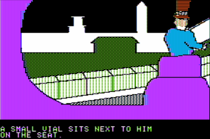 In gameplay, I had passed this moment and been stuck for a long time. I needed a hint. I had already done LOOK DRIVER — the Apple II version requires that in order to get the exact phrasing CLIMB IN for boarding the cab — but doing LOOK DRIVER a second time is necessary after boarding to see the vial. Just LOOK while riding doesn’t work.