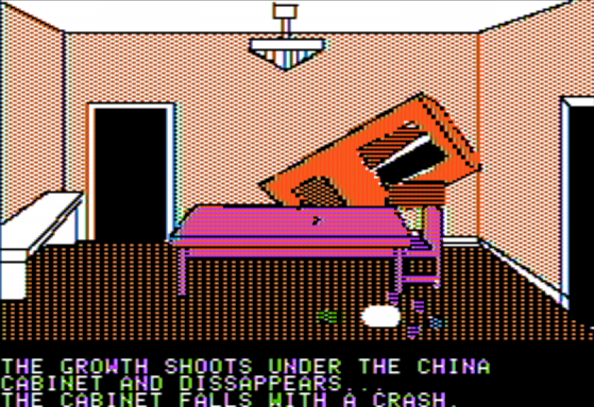 I figured out how to do this on my own because if you go in the pantry with the growth, it jumps at the food and gets too large and it’s game over. I did not know how to convey knowledge about a death-route in the “story” description other than using intuition. Our hero remembered branches of life not taken, I suppose. 1981 games didn’t care too much about if a “continuous narrative” was truly possible; learning by death was often a feature, not a bug.