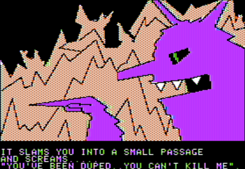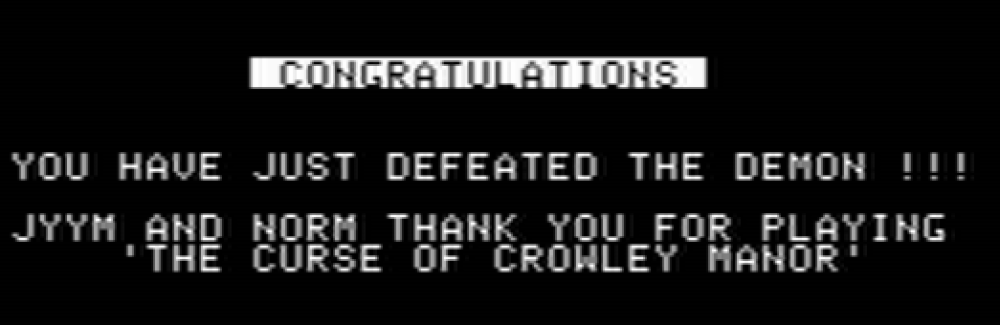 A monster — different than this one — appears at the combination door and kills you if you don’t have the holy water vial. The game tries hard to indicate you don’t have enough to win, but it’s hard to tell if the demon’s taunting is “in universe” acting in typical demon fashion or meta-referencing your lack of an inventory item.
