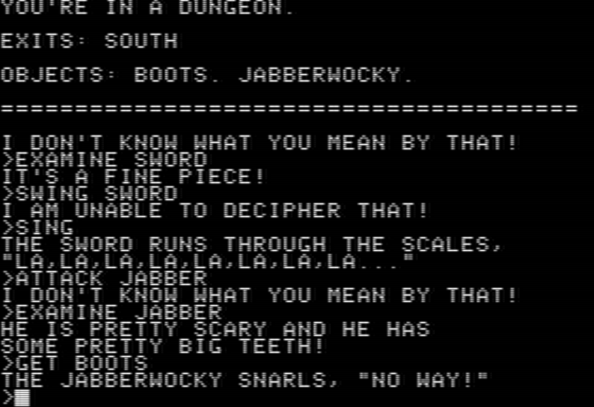 The game starts unapologetically wide open, with lots of items to grab (quickly breaking a six-item inventory limit), puzzles to consider, and perhaps most interestingly, NPCs to have minor interactions with. Example, after finding a singing sword elsewhere: