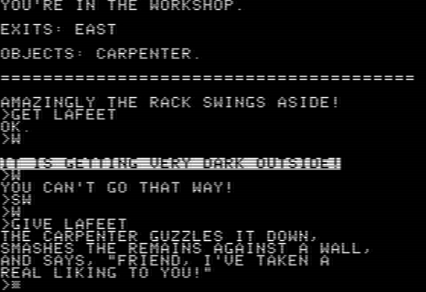 The basement includes the jabberwocky, Bill the maintenance man (hanging out near a rusted metal box I can’t open), a carpenter who states “In vino veritas” and a wine cellar with a hidden bottle which counts as a treasure. You can make friends with the carpenter by giving over the wine bottle …