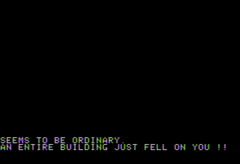 Still, this was pretty brisk like Tanker Train, and I’m hopeful the author has shaken out the fussier puzzles out of his system. I theorize part of the reason commercial games often had absurd puzzles in this era is the feeling that if progress is “too smooth” then the game is insufficiently dense, with “not enough game” to it. $20 was not an atypical price (that’s what each Scott Adams game cost); with inflation that would be close to $60 in 2021 money. With the amount of content possible in a TRS-80 game, an “easy” game would be over in less than an hour (like Local Call for Death) — is that worth $60 of your time? Mind you, its relative smoothness might be why Local Call for a Death is superior to much of the work of the period, but I could see sheer economics would make authors reluctant. With Roger M. Wilcox’s private games, economics wasn’t a concern, but he was still emulating the games he saw, and he mentions in a comment two moments from the game are direct homages