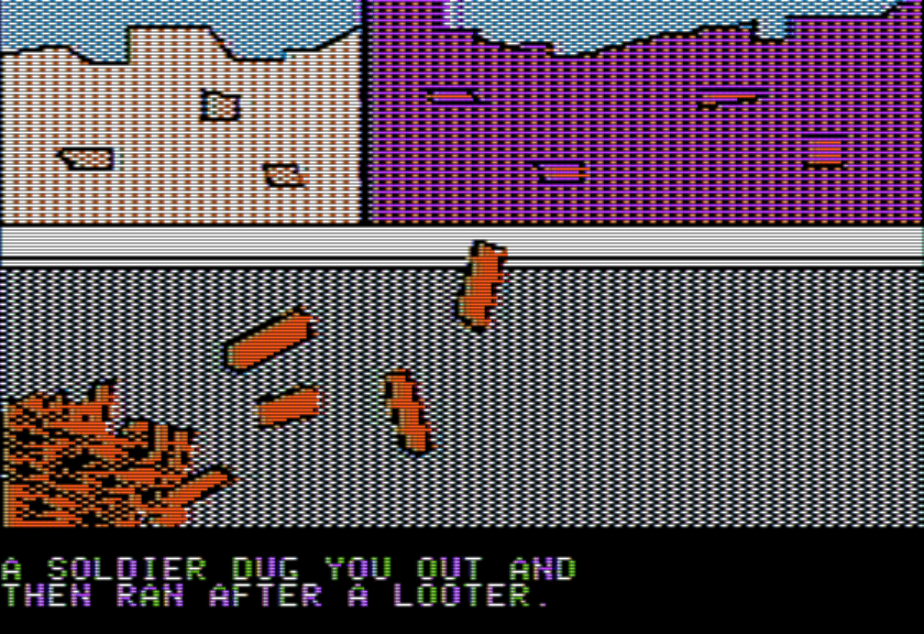 Just to show off the how the text side looks, although this scene also lets the player know about the soldiers shooting looters.