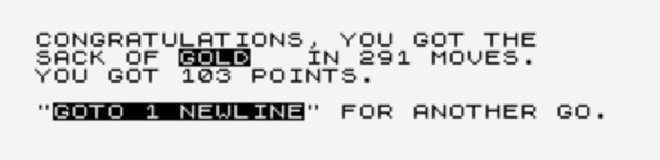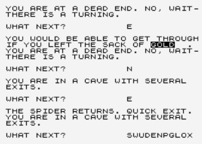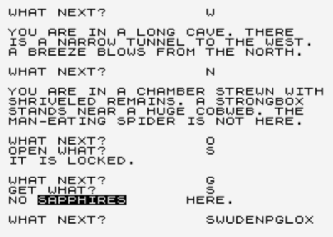 Gold still exists as an interesting specimen of trying to make an adventure with limited flexibility of action. It’s also somewhat astounding how awkward it still is to control; the specify-objects-by-their-first-letter system is somehow worse when it fails than a parser. “I didn’t understand that” — fair, I was trying to take an spiderweb but it was just an item of decoration — “I don’t see any sapphires here” — what? The first seems like intransigence but not fatal, while the second is a straight error, and made me feel uncomfortable in my actions, like I wasn’t getting a real treasure, but a fake virtual one that sets a variable flag.