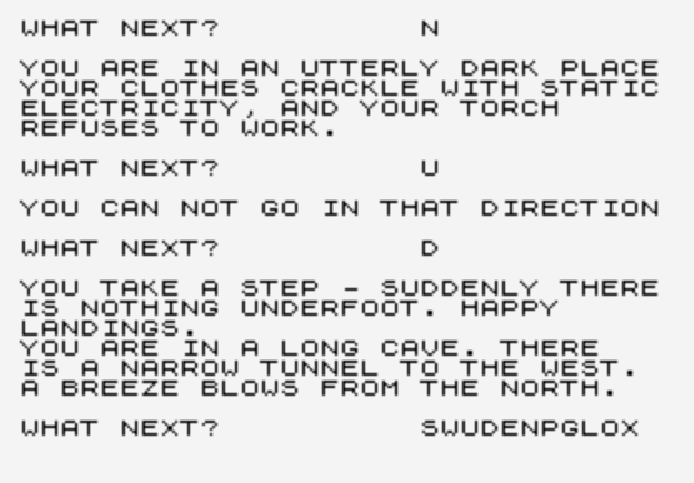 … a slightly erratic verb list (TAKE but not GET, TURNON and TURNOFF as single words), and a generic message of “THERE IS SOMETHING IN YOUR WAY” on exits that are blocked off for puzzle reasons (without much help as to what is causing the blocking).