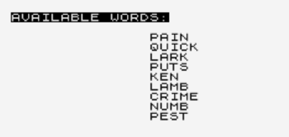 For example, if you can pick KEN, CRIME, and PEST, you win the game, since they all have the letter E. I admit I don’t know what the optimal strategy is, but the game claims on difficulty level 2 the best you can do is hold the computer to a draw.