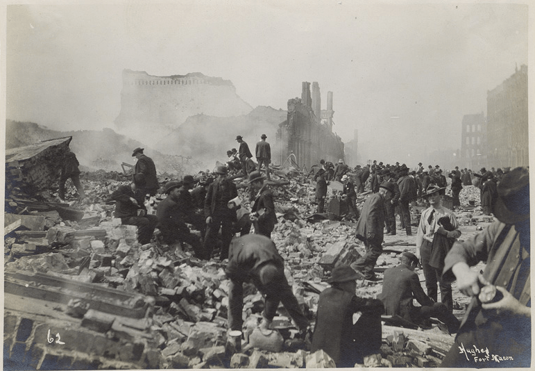 On April 18, 1906, the San Andreas fault ruptured, estimated magnitude (by most current research) from 7.7 to 7.9. It lasted less than a minute but was devastating: buildings collapsed, fires raged through the city, and the water mains broke meaning the firefighters couldn’t use them. Artillery troops tried to control the blaze by dynamiting particular buildings (it didn’t work). Full-on looting caused the mayor to declare looters would be shot on sight. Estimated deaths were originally at 700, although that likely understates the true number by at least a factor of 3.
