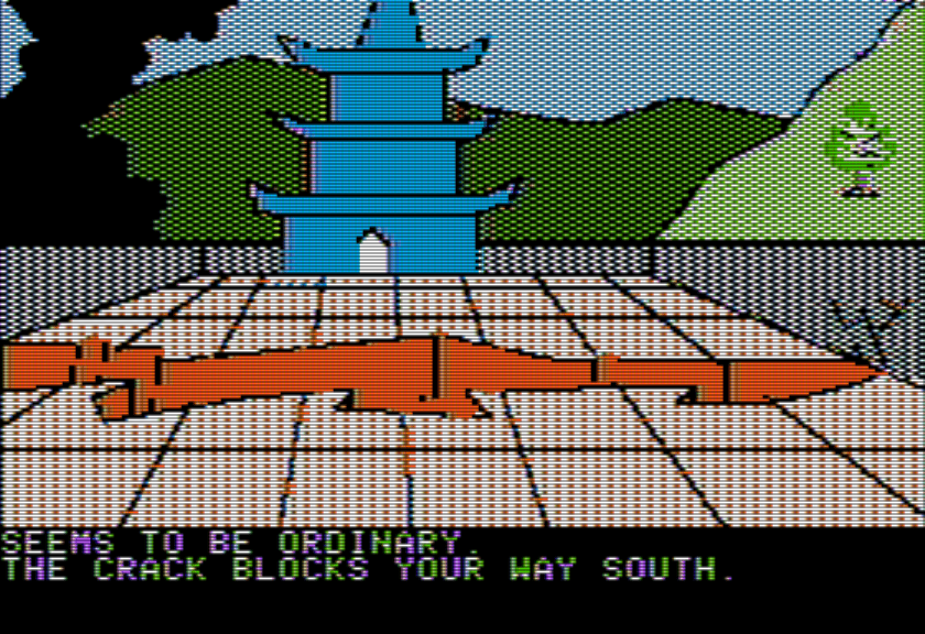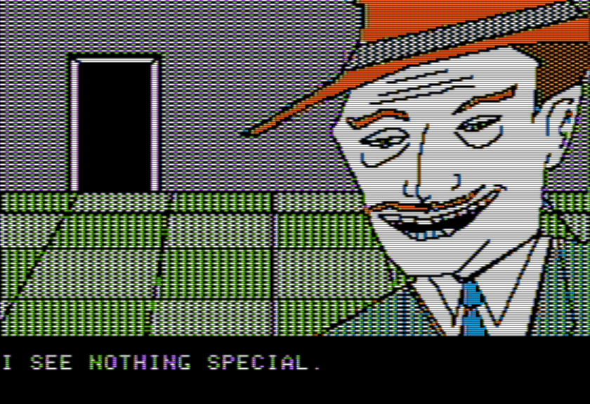 This would have been fine had the soldier only appeared once, but he camps if you bring along any items whatsoever. It turns out — again I just looked up hints — you can OPEN DOOR in one of the locations just past the soldier, which will lead you back to the hotel room. Then, subsequent OPEN DOOR commands will let you skip the soldier area. I assume the intent was a door that was locked on the other side that you then unlocked, but if you try to refer to that door from in the hotel room before reaching it from the other side, the game just goes “HUH?” like it doesn’t exist.