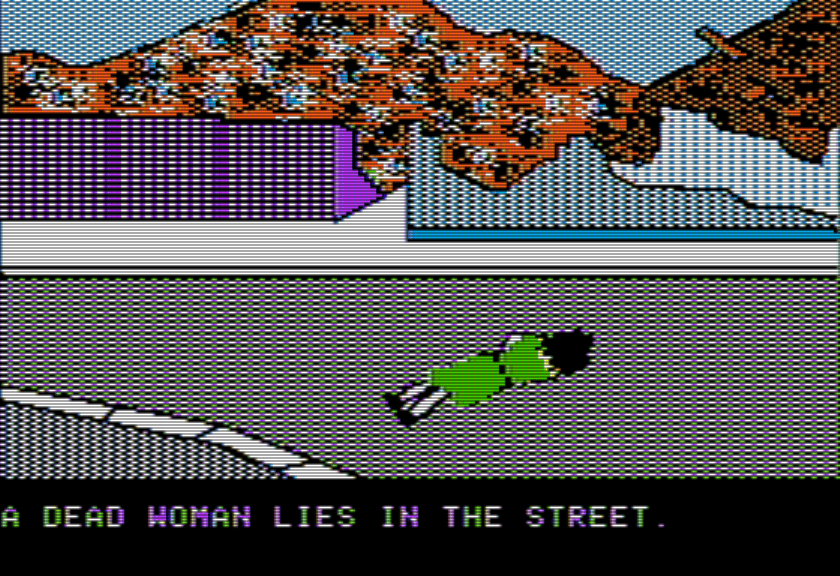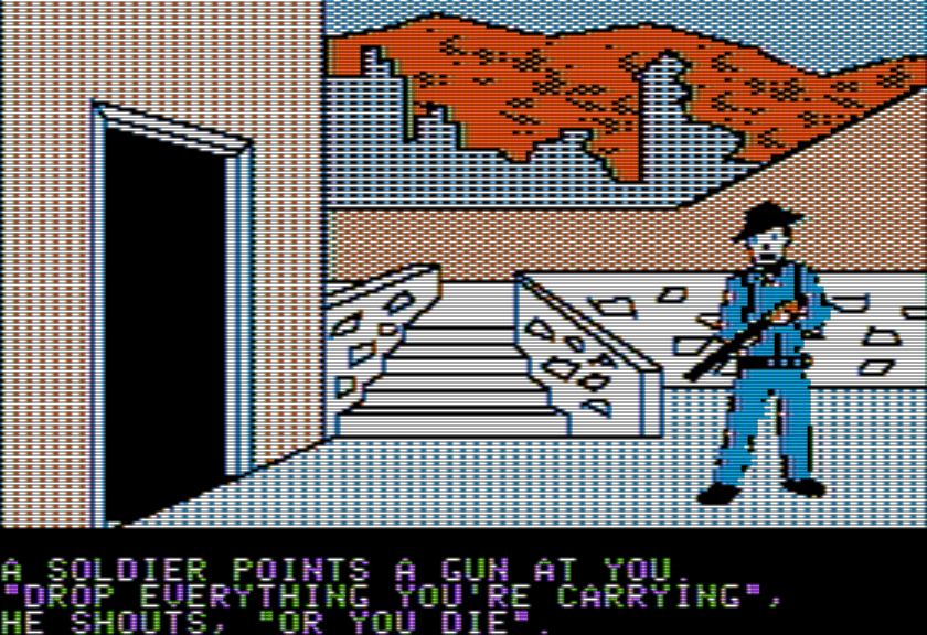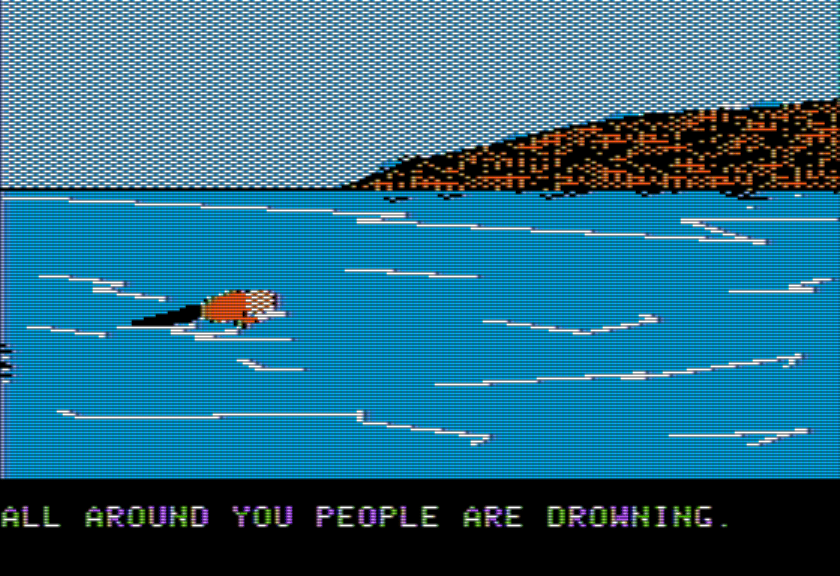 The immediate words that come to mind here are “wasted potential”. There’s a fair number of intense scenes: you get buried under a building and the screen turns black, you have to shoot a soldier who thinks you’re a looter (or is just shooting without caring), you have to deal with a soldier who is himself a looter, and the boat to safety turns out to be a deathtrap. However, the overlay of parser frustration ruined many of the parts, and the tone was just off — it’s simply difficult to convey the gravity of mass death in the format of sharply truncated text and slightly askew Apple II graphics.