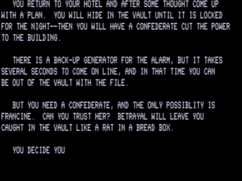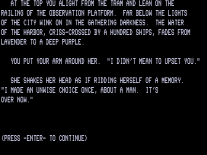 Finally, you get to make a choice — you can call either Daisy or Francine the next day to spend time with them, and this also opens the opportunity for romantic choice (although, as you’ll see, it isn’t forced). Before plowing ahead with the plot — is this the first time this has happened in a computer game? That is, there is a choice of romantic partners, like many a visual novel? We can dip all the way back to 1930 with Consider the Consequences for this kind of choice in a printed book, but in electronic form?