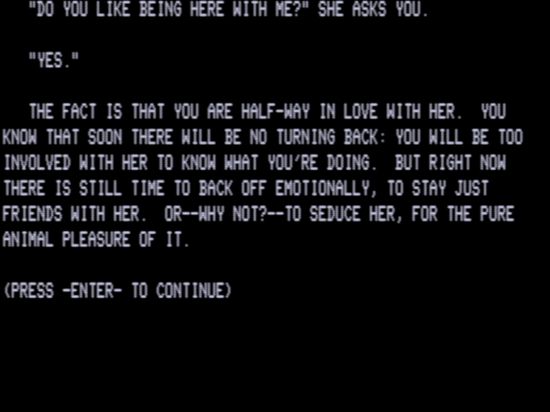 What makes this doubly interesting (if not great gameplay-wise) is that the reactions to Daisy and Francine are entirely different. Daisy only responds positively to “seduce” (if you try for “love” she responds “GOD WHAT A BORE MEN ARE.”); Francine, on the other hand, responds the best to “love”.