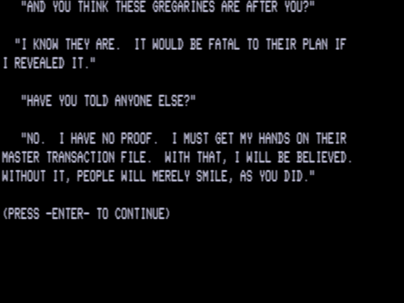 With INFINITE INFLATION, your imposter disguise holds, and you get an invite to the Gregarine HQ. Our goal now (which was in one of the screenshots earlier) is to get the MASTER TRANSACTION FILE. However, the file is in a vault that needs to be broken into at night, and you need a confederate.