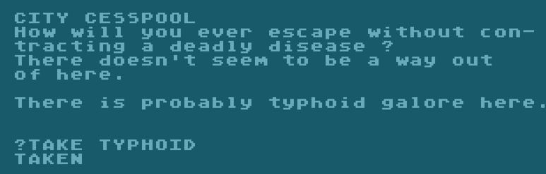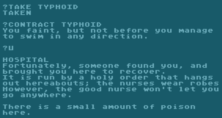 …so the correct thing is to simply DROP TYPHOID. Cured! (“You improve 100 percent, and are able to walk again.”) Then you can escape, and the only reason for the whole sewer sequence was to pick up some poison. The world is “open”, so to speak…