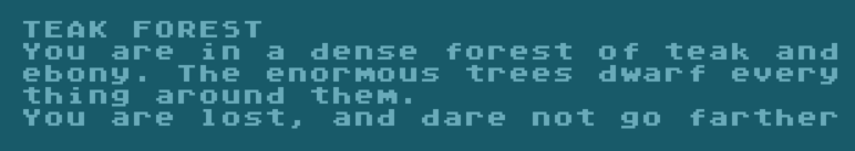 … a slightly erratic verb list (TAKE but not GET, TURNON and TURNOFF as single words), and a generic message of “THERE IS SOMETHING IN YOUR WAY” on exits that are blocked off for puzzle reasons (without much help as to what is causing the blocking).