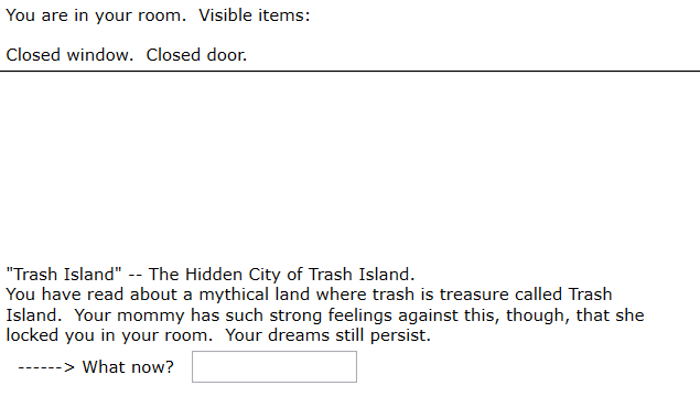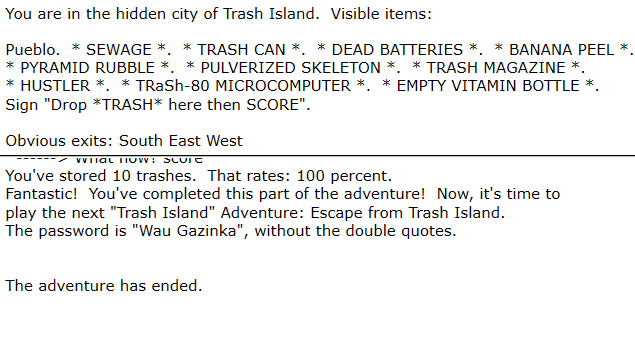 although the first two he later combined into a single game, Trash Island. A password from that game is needed to go onto the last one (which I’ll play next). And in case you’ve lost track (and I know I have) these are games #16, #17, and #18 of his complete collection of twenty-one adventures which started in 1980 with Misadventure and were never “published” until recently, except for uploading adventure #7 (Vial of Doom) to the Internet sometime in the 1980s.