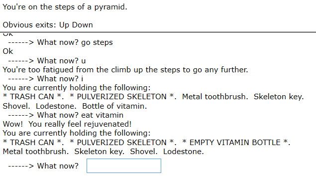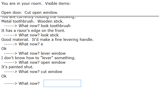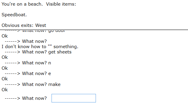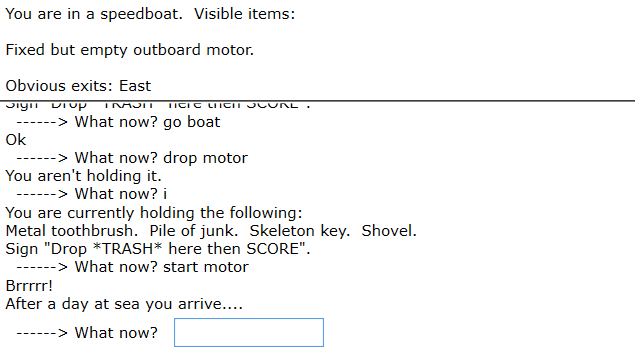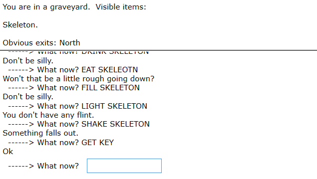 I did my usual technique of rattling down a bunch of verbs that I’ve seen before, and it turned out to be super useful in this game. I didn’t know what to do with the skeleton until I hit upon SHAKE; sort of a meta-solve, since I wasn’t shaking as an intentional action, but as an attempt to try everything. (The skeleton key is incidentally useful for opening a “fiberglas” factory which has some of the materials for the speedboat. With those materials plus the glue…