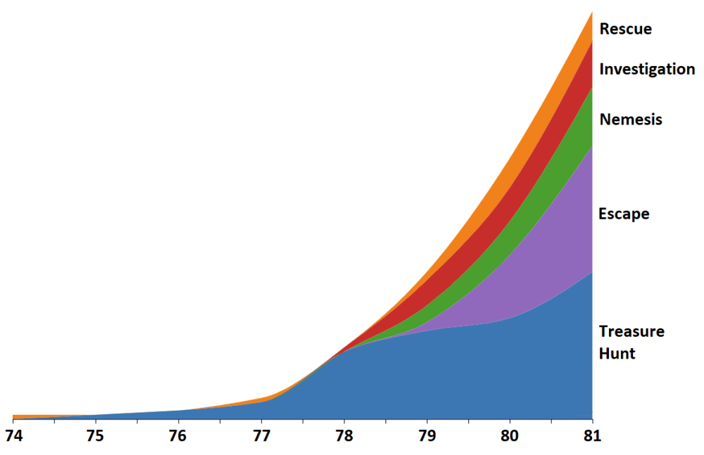 Also — and I didn’t notice this until I made the chart — the Escape-style plot has been slowly increasing to now be about equal in proportion to that of Treasure Hunts. They tend to be very simple (Deathmaze 5000 just says “Your only goal is to leave Deathmaze. Alive.”) so I’m not surprised, and the only thing I would have perhaps expected to be bigger is the Nemesis category, since “find Foozle X and defeat them” also has a certain simplicity to it, although it perhaps is a bit genre-restricting.